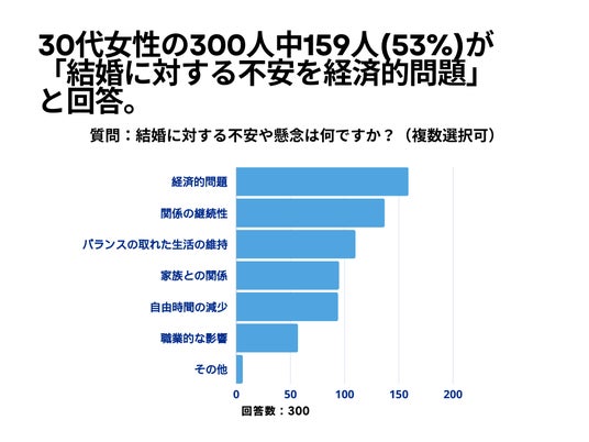 30代女性の300人を対象とした「結婚に対する不安や懸念は何ですか?」というアンケートで159人(53%)が「経済的問題」という結果になりました。