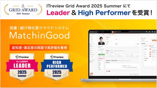 アイティクラウド株式会社が運営するIT製品レビュープラットフォーム「ITreview(アイティレビュー)」(本社:東京都港区、代表取締役社長 :黒野 源太)において、満足度・認知度の双方で高い評価を獲得。「ITreview Grid Award 2025 Summer」にて、人材派遣管理システム部門(中小企業部門)で「Leader」、人材紹介管理システム部門で「High Performer」として表彰されました。