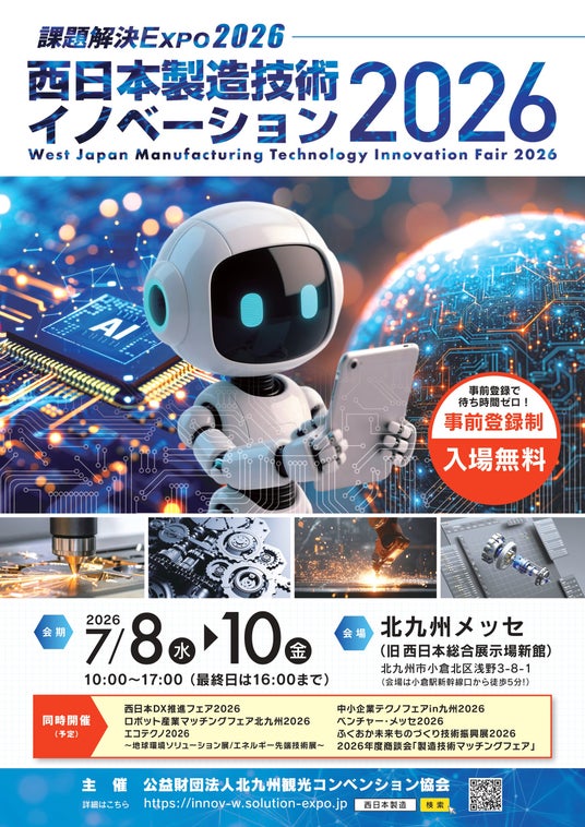 『課題解決EXPO2026』とは、福岡県北九州市小倉北区の西日本総合展示場で2026年7月8日(水)~10日(金)の3日間にわたり開催される総合展示会です。製造現場向けの「西日本製造技術イノベーション」、デジタル技術の推進を目的とした「西日本DX推進フェア」、環境ビジネス振興を対象とした「エコテクノ~地球環境ソリューション展/エネルギー先端技術展~」、中小企業の取引拡大を目的とした「中小企業テクノフェアin九州」など、7つの展示会と商談会を同時開催します。