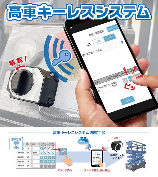 高車キーレスシステムは、高所作業車の予約調整・位置・稼働状況の管理が実施できる「高車管理」アプリの予約者のみにデジタルキーを発行して、鍵の解錠を制御できるシステムです。高車の鍵の管理が不要となり、点検終了が解錠条件となるデジタル日常点検機能と連動させれば、日常点検記録の管理も効率化されます。