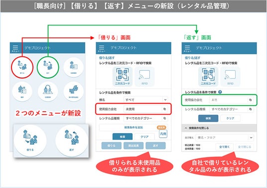 [職長向け] 【借りる】【返す】メニューの新設(レンタル品管理)