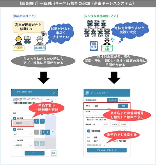 高車キーレスシステムを利用中の現場において、「高車の場所を少しだけ移動したい」など一時的な利用の際に、予約~鍵ダウンロード~作業前点検実施~解錠という一連のプロセスが手間に感じるというご意見をいただいておりました。また高車の月次点検の際に、委託先のレンタル会社担当者にて、このプロセスが手間になるとともに、管理番号などでも検索できると便利とのご意見をいただいておりました。