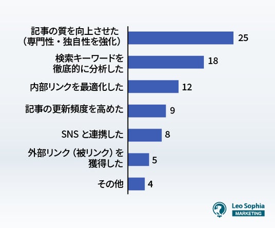 これらの結果から、SEOオウンドメディアの成功の鍵は「質の高いコンテンツ」と「的確なキーワード選定」にあることが明確です。特に「記事の質向上」が最も効果的と回答された点は、Google検索アルゴリズムが年々コンテンツの質を重視する方向に進化していることとも一致しており、単なるキーワード詰め込みではなく、ユーザーに真に価値ある情報を提供することの重要性を示しています。