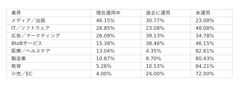 業界別にSEOオウンドメディアの運用状況を分析すると、ITや広告・メディアなどの情報発信と密接に関わる業界ほど運用率が高い傾向が明確に表れています。特に「メディア/出版」業界では46.15%が「現在運用中」と回答しており、他業界と比較して突出して高い運用率を示しています。