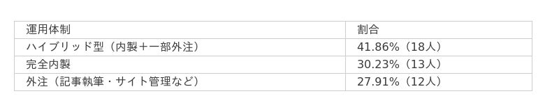 SEOオウンドメディアを現在運用している企業では、内製と外注を組み合わせた「ハイブリッド型」の運用体制を採用しているケースが運用中の43人のうち、41.86%(18人)と最も多いことが明らかになりました。