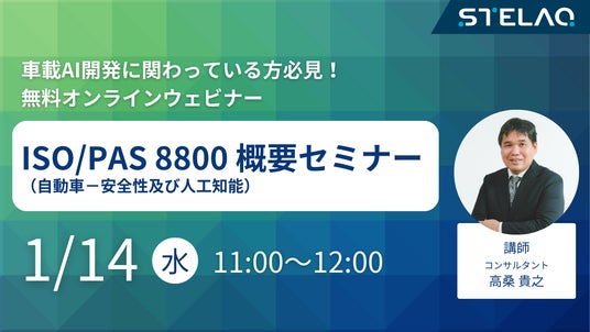 ソフトウェア領域へのエンジニアリングサービスを提供する株式会社STELAQ(本社:東京都渋谷区、代表取締役社長:山本 美希子)は、無料オンラインウェビナー「ISO/PAS 8800(自動車-安全性及び人工知能)概要セミナー」を2026年1月14日(水)11:00~12:00に開催します。