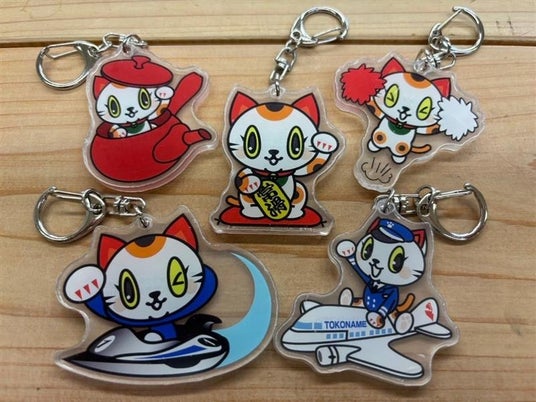 「トコタン」を、お出かけのお供にぴったりのアクリルキーホルダーに仕立てました。急須、飛行機、競艇など常滑らしいモチーフをデザインした5種類からお選びいただけます。