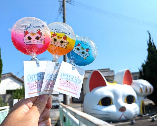 今回発売されている新商品には、常滑のシンボルとしてやきもの散歩道に飾られている、幅6.3m、高さ3.8mの巨大な見守り猫「とこにゃん」と、招き猫である常滑市キャラクター「トコタン」がデザインされています。「とこにゃん」のアクリルスタンドや、パッケージに「とこにゃん」がデザインされたペロペロキャンディーは、実物の「とこにゃん」と一緒に写真を撮ってお楽しみいただけます。その他にも、「トコタン」の御守りやアクリルキーホルダーも販売します。また、LINE STOREでは、招き猫である常滑市キャラクター「トコタン」のスタンプも大好評発売中です。