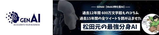 「GENAI」は、松田氏の過去12年間で発信した600万字超のコラムと15年間の全ツイートを学習し、膨大な知識を詰め込んだ松田元の分身として誕生したWeb3特化型の松田氏の分身AIです。