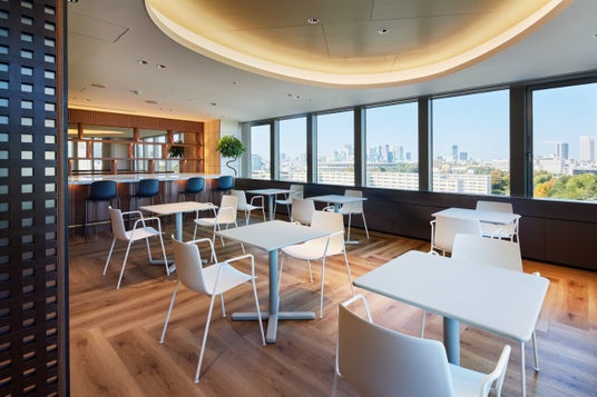 青山一丁目駅直結。窓の向こうに広がるグリーンビューと、家具付き・レイアウト自在の180平方メートル ラウンジ。ジャスミーの事業やコンソーシアムに関わる企業・パートナーを中心に、50~70名規模の交流会/セミナー/撮影など、ビジネスとコミュニティが交わる場としてご利用いただけます。