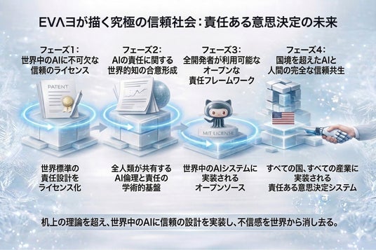 EVΛヨが描く、AIと人間が国境を越えて信頼し合える究極の未来。ライセンス化からオープンソース化を経て、全産業の標準インフラを目指します。