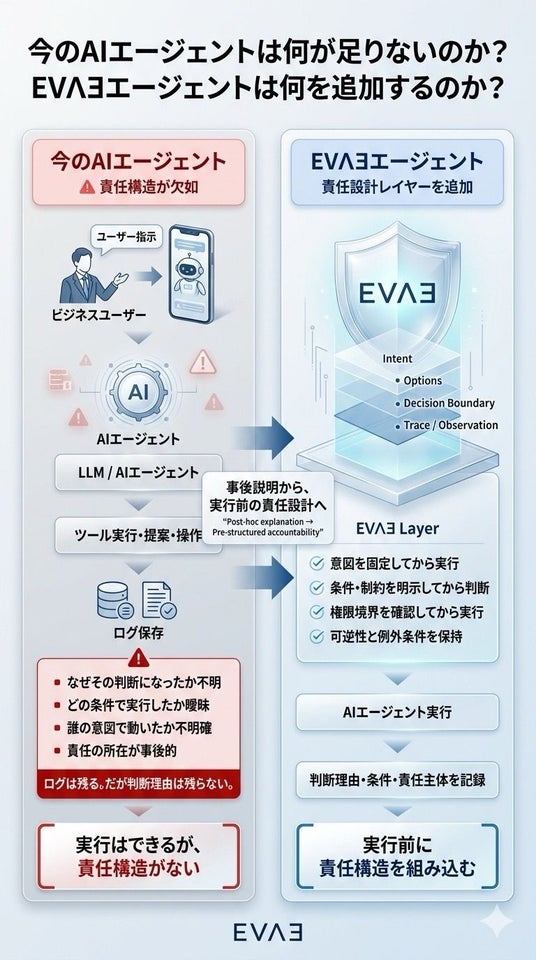 従来のAIエージェント(左)と、EVΛヨによって責任設計が組み込まれたエージェント(右)の構造比較