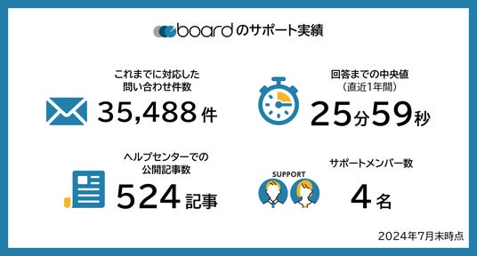 boardは2014年のリリース以降、これまでに35,000件以上のお問い合わせに回答してまいりました。この内、直近1年間における回答までの所要時間の中央値は25分59秒でした。