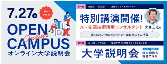 7月27日に開催予定の第3回の講師は、AI・先端技術活用コンサルタントの大西正之さんです。シスコとマイクロソフトの米国本社で技術者として活躍し、世界約30か国での情報支援を行ってきたご経験や、ITの台頭から現在そして未来、人とITの関わり、IT業界でのキャリア形成についてお話しいただきます。