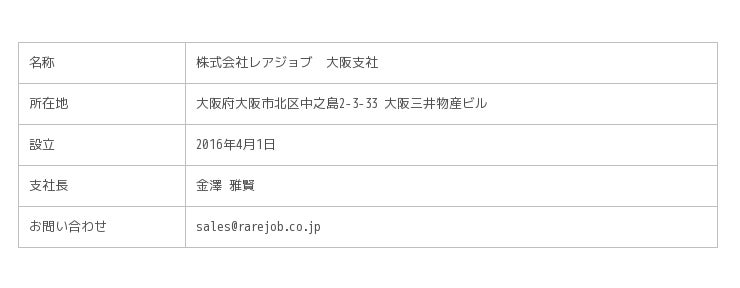 オンライン英会話サービス事業を運営する株式会社レアジョブ(本社:東京都渋谷区、社長:中村 岳、以下「レアジョブ」)は、「レアジョブ英会話」法人事業の拡大に伴い、大阪支社を設立し、本日より営業開始いたします。