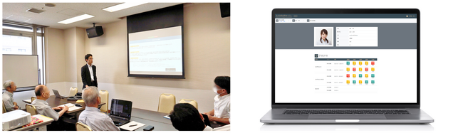 ▲(左)地域産業研究会で発表をする様子 / (右)AI関連技術を活用した団体・企業向けの研修補助ツール「AIDARD」の画面イメージ