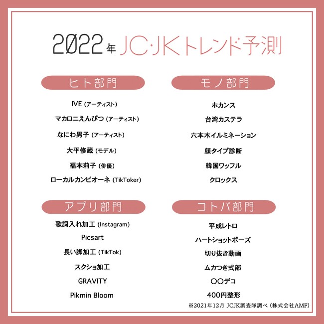 女子中高生向けのマーケティング支援などを手がける株式会社AMF(本社:東京都港区、代表取締役:椎木里佳)は、トレンドのリサーチが得意な”JCJK調査隊”の精鋭メンバーの選考結果をもとに、「2022年のトレンド予測」を、「ヒト・モノ・アプリ・コトバ」の4部門に分けて発表いたします。