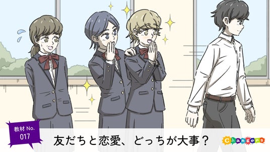 「『友だちと恋愛、どっちが大事?』では、強いきずなで結ばれていた三人の関係が、一人の恋愛をきっかけに少しずつ揺らいでいく様子を描いています。登場人物それぞれの繊細な気持ちの変化を通して、児童生徒が共感的に理解を深め、『あのときどうすればよかったのか』『これからどうすればよいのか』と考えながら議論をしていくことをねらいとしています。これにより、自分たちの身近な人間関係を自分の事として見つめなおすきっかけを作ることを目的としています。