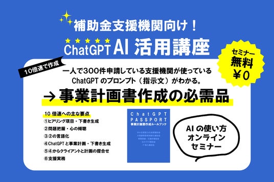 ~ものづくり補助金専門AI「サトウさん」の同時リリースと共に、その他ChatGPTと一緒に使い方・ノウハウを提供。補助金支援機関の業務効率化、「事業計画書」作成支援を加速~