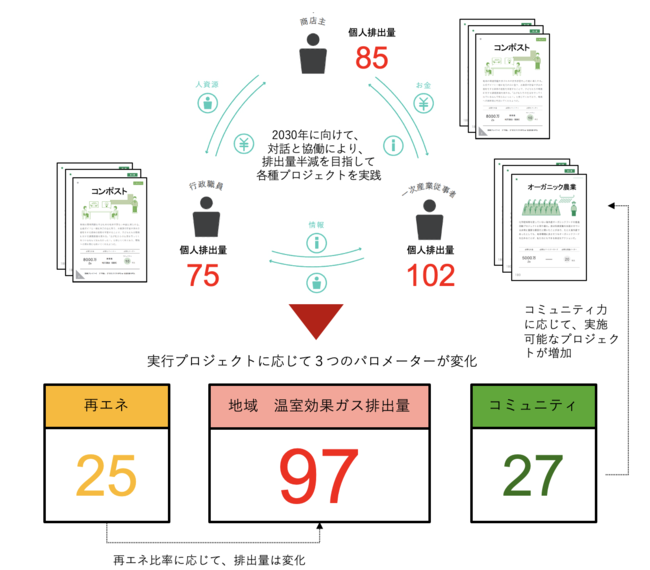 行政、金融機関、民間企業などのさまざまな地域プレイヤーとして、2030年までに地域全体の温室効果ガス排出量の半減に向けて様々なプロジェクト実施にチャレンジするシミュレーションゲーム