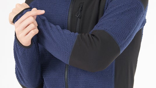 さらに、肩周りや肘、サイドパネルなどにはストレッチ素材を配置し、動きやすさをプラスしたハイブリッド構造。身体のラインに沿ったスリムなシルエットは、単体だけでなく、重ね着でも重宝します。
