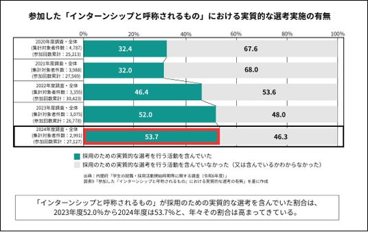 内閣府の調査では、参加した「インターンシップと呼称されるもの」のうち「採用のための実質的な選考を行う活動を含んでいた」割合が、2024年度に53.7%となり、年々上昇しています。