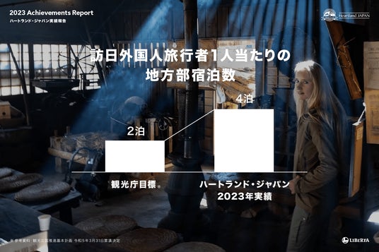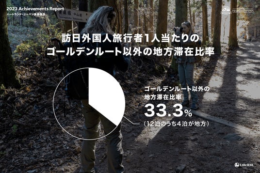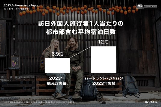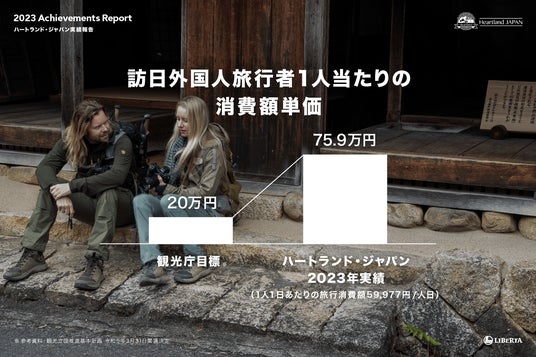 欧米顧客を地方に誘客することで地域活性化に取り組むベンチャー企業、リベルタ株式会社(本社:東京都新宿区、代表取締役:澤野 啓次郎、以下、リベルタ)が提供するインバウンドトラベル事業「ハートランド・ジャパン」。2023年度(2023年6月~2024年5月)の取り扱い実績をまとめたところ、外国人のべ宿泊者数約13万5千人泊、訪日外国人旅行消費額単価では約76万円/人(1日当たり約6万円/人)、東京・富士山・京都などゴールデンルートと呼ばれる定番地域以外の地方部宿泊数は平均4泊と、観光庁による第4次観光立国推進基本計画が掲げる目標値を大きく上回る結果となりました。また、観光庁が発表した2023年の訪日外国人の平均泊数が6.9 泊であるのに対しては12泊と、2倍近く上回る結果となりました。