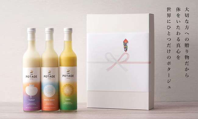 THE POTAGE(ザ・ポタージュ)は、日本国内の選び抜いた産地で生産された希少な野菜のみを贅沢に使用 し、少量の塩・オリーブオイル・水のみで仕上げた、今までにない特別なポタージュです。 これまで世界のトップアスリートやトップモデルなど、体をケアするプロフェッショナルに消化・吸収の 観点から支持され、愛され続けてきたポタージュを多くの皆さまへお届けできるよう、新しいブランドと して誕生しました。ご褒美の時間のあたらしい選択肢として、大切な人の体を想うギフトとして、 すべての人へ濃厚で口いっぱいに広がって離れない、記憶に残る最高のひとくちをお贈りします。