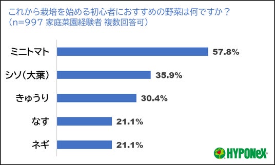 4.家庭菜園初心者へのおすすめの野菜: 家庭菜園経験者が未経験者におすすめする野菜はミニトマトが57.8%、シソ(大葉)が36.0%とマンションベランダでも可能な野菜が上位となりました。