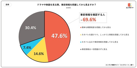 全国の10代~50代の男女を対象に、「ドラマや映画を見る際、事前情報を把握してから見ますか?」というアンケートを実施したところ、事前情報を把握してから見る人は69.6%でした。その内訳は、「簡単な概要程度を把握してから見る」が47.6%、「ネタバレを避けつつ、しっかりと情報を把握してから見る」が14.6%、「ネタバレ込みで事前情報を把握してから見る」が7.4%となりました。また、「事前情報は一切把握せずに見る」と回答した人は30.4%でした。