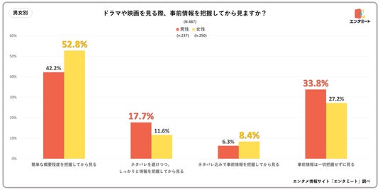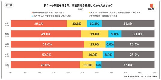 年代別で見ると、20代・30代・40代はほとんど差がありませんでしたが、10代と50代では事前情報を把握してから見る人の割合が他の年代よりも低くなりました。しかし、内訳で見ると50代は「ネタバレ込みで事前情報を把握してから見る」が4%に留まったのに対して、10代は約10%にのぼり、他の年代と比較しても最も高い数字となりました。いわゆるZ世代の間では、コンテンツや商品の内容や中身を知った上で視聴・購入する「ネタバレ消費」と呼ばれる消費行動が広がりつつあると言われています。Z世代はSNSや動画サイトなど大量のデジタルコンテンツに囲まれて育った世代ですが、こうした環境でいかに"当たり"のコンテンツを効率的に消費できるか、というタイムパフォーマンス重視の考え方がネタバレ消費という新しい価値観をもたらした要因になっていると考えられています。エンタミートでは、ドラマや映画をはじめとしたエンタメに関する幅広い情報を発信しています。作品の概要を紹介する記事からストーリーを深く考察する記事まで、それぞれの視聴スタイルにピッタリの記事がきっと見つかるかと思います。映画・ドラマに関してリサーチする際は、ぜひエンタミートをご活用ください。