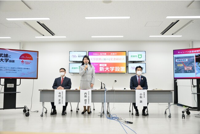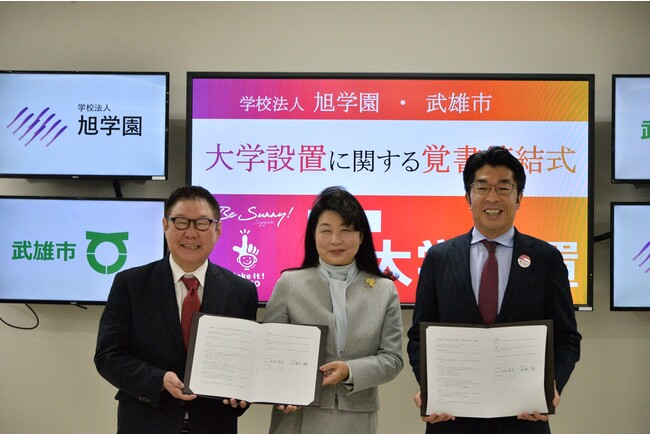 武雄市は、令和5年2月15日、学校法人旭学園との新たな教育連携事業に関する包括連携協定締結を発表するとともに、学校法人旭学園より内田信子理事長、佐賀女子短期大学今村正治学長、武雄市小松政市長による締結式が執り行われました。