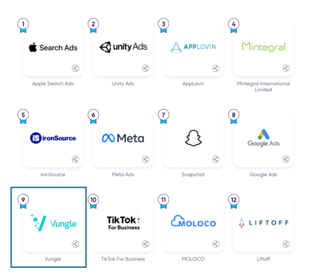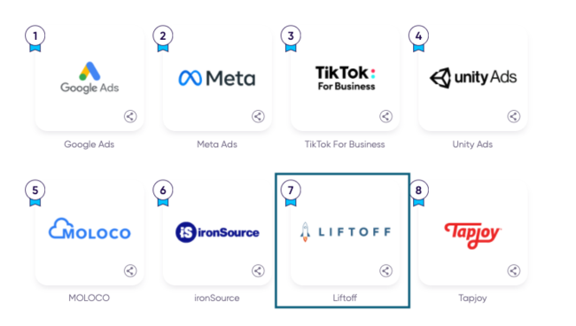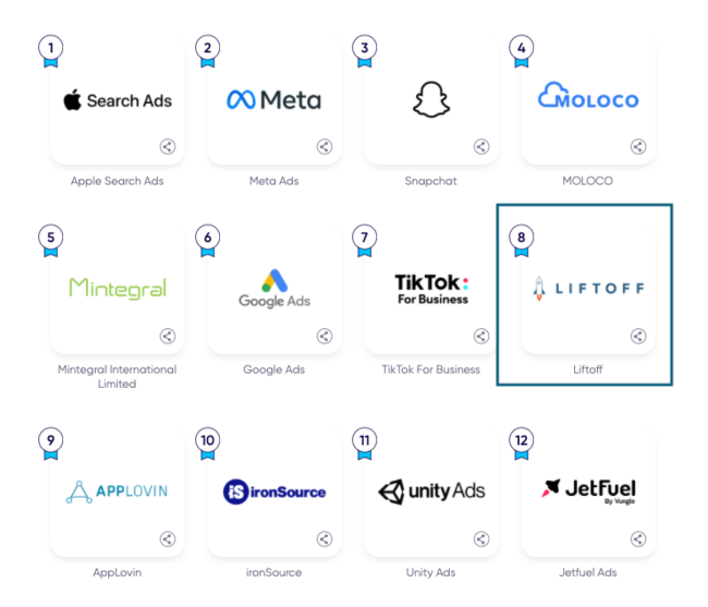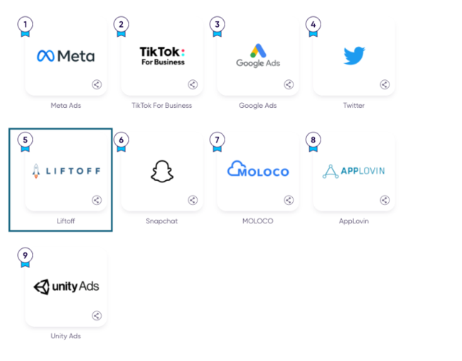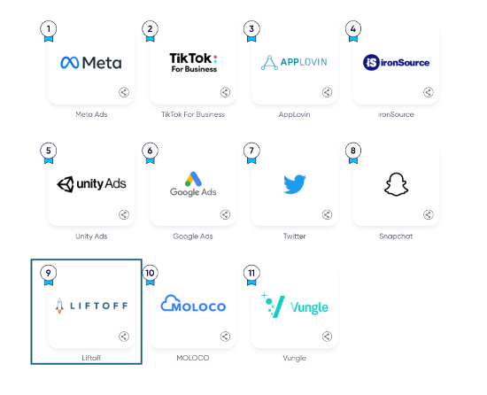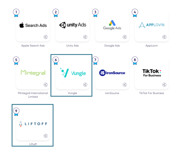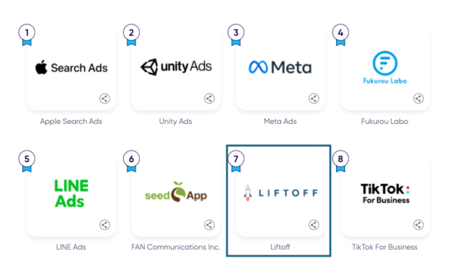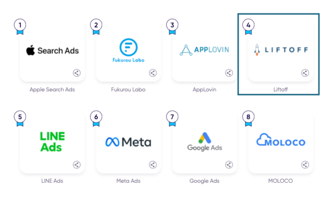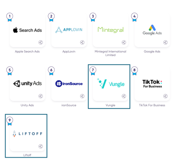 AppsFlyerが発表する「パフォーマンスインデックス第14版」にて、Liftoff + Vungle が5つの指標別の394種類のPower ranking/Volume rankingでトップ10に選出