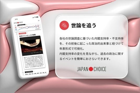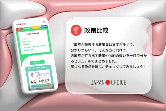 「JAPAN CHOICE」は、2017 年、特定のイデオロギーに固執しない政治的公平性を担保しつつ、 事実と解釈を分別した網羅的な政治情報の発信を開始しました。全ての有権者に対して、 投票に行く際の手助けとなる情報を提供することを目的としており、 前回の参議院選挙では約260万人のアクティブユーザーさまに利用していただいています。今回は最新版の公開を予定しています。