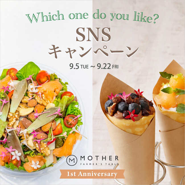 JR川崎駅前の複合商業施設「ラ チッタデッラ」(神奈川県川崎市川崎区小川町/運営:株式会社 チッタ エンタテイメント/代表者:美須アレッサンドロ)にあるサラダ&クレープ・ガレット専門店『FARMER’S TABLE MOTHER (ファーマーズテーブル マザー)』(以下「マザー」)は、2023年9月5日(火)に1周年を迎えます。この度1周年を記念し、特別企画として9月5日(火)~22日(金)までの期間中ご来店いただいた方にInstagramにてフォロー&タグ付け投稿いただくと次回以降「サラダ1食」または「クレープ1つ」をお得に楽しめる“Which one do you like?(どちらがお好み?)”SNSキャンペーンを開催いたします。