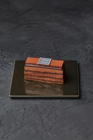 ピスタチオ風味のチョコレートにビターチョコレートのムース、ビスキュイショコラを重ねた「ドゥジャ ピスターシュ」は、新作のガトーです。
