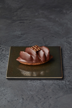 秋の人気ガトー「テュラン」。アーモンド風味のサブレ生地にマロンクリームとカシスを合せ、ビターチョコレートでコーティングしました。