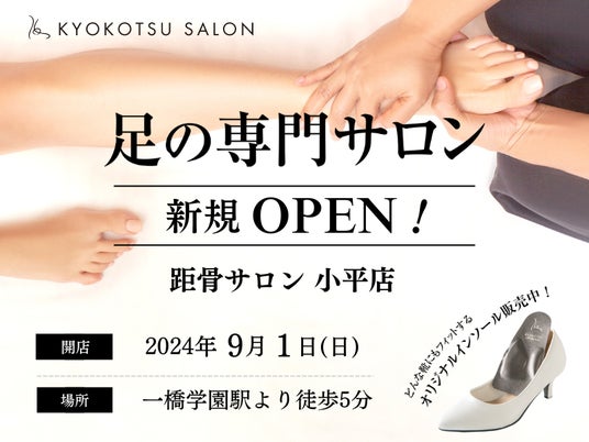 全国86店舗で年間2万人の足トラブルを改善している距骨サロンが、2024年9月1日(日)に東京都小平市の西武多摩湖線「一橋学園駅」から徒歩5分の好立地に新規OPENいたしました。