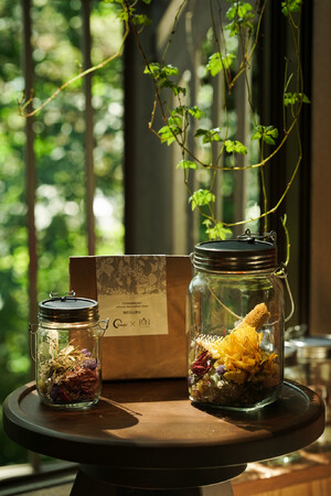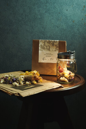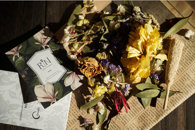 “MEGURU”は、瓶の中に入れて「ソネングラス(R)︎」をデコレーションするドライフラワーで、生花店や式場などで役目を終えた花たちをアップサイクルしている「RIN」の花たちを使用しています。ドライフラワーへ加工する過程や、ディスプレイの制作時に図らずも生まれてしまう色鮮やかな花びら一枚まで、大切に、花の生命が最後まで輝くように、という思いから生まれた商品です。