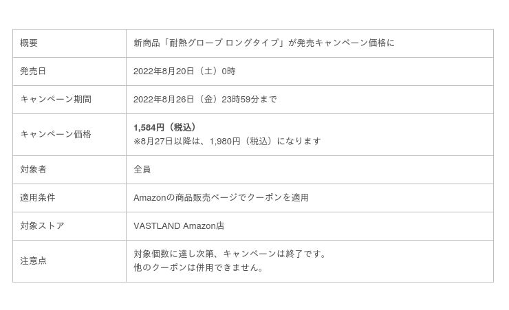 VASTLAND株式会社(本社:兵庫県姫路市/代表:田中悠貴)は、火の取り扱い時に適した「耐熱グローブ ロングタイプ」を2022年8月20日(土)にAmazon店で先行発売することを決定しました。また発売を記念して、Amazon店限定で「発売キャンペーン」を開催します。