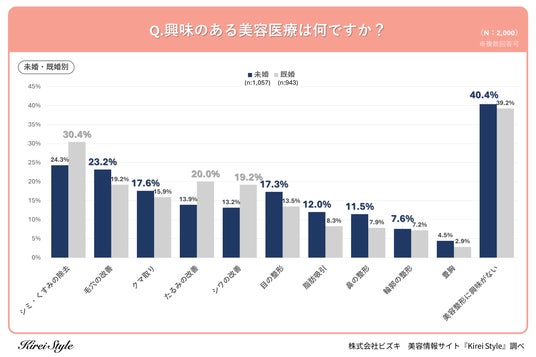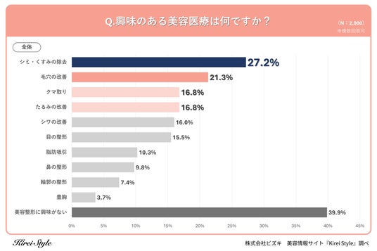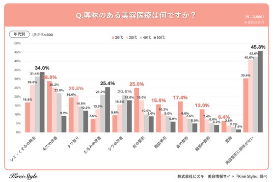 「今のキレイも、10年後の輝きも」をコンセプトに美容や健康にまつわる情報を発信する「Kirei Style(キレイスタイル)」の運用を行う株式会社ビズキは、全国の女性2,000人を対象に美容医療に関するアンケートを実施し、年代別等の特徴についてまとめました。