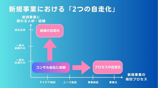 bridge社では、コンサルなどの外部サポートだけに依存せず、自社にナレッジを溜め、自社のリソースによって新規事業を成功に導いていく企業活動を「新規事業の自走化」と呼び、サポートを続けてきました。自走化には「プロセスの自走化」と「組織の自走化」の2種類が存在し、その両輪を段階的かつ円滑に回していくことが、多くの新規事業を自社で実装していくための成功の鍵だと位置付けています。