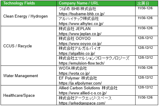 出展が決定した国内スタートアップ10社は、Green Zone内のStart Up Villageに各社ブース出展し、脱炭素や気候変動適応技術等の展示を行います。