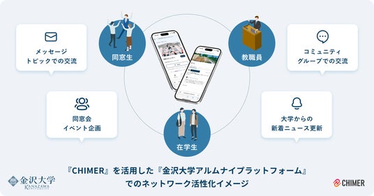 笑屋株式会社 (本社:東京都千代田区、代表取締役 真田幸次) が開発・運営するアラムナイプラットフォームCHIMER (チャイマー) が、国立大学法人金沢大学 (学長 和田隆志) の同窓生・在学生・教職員がつながることができるWebプラットフォーム「金沢大学アルムナイプラットフォーム」として導入され、令和7年4月より運用がスタートしました。