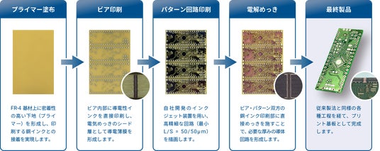 特に、10兆円規模のPCB市場において数量ベースで大きな割合を占める汎用多層基板を主なターゲットに位置づけ、2024年には同領域向けのインクジェット印刷装置、ならびに先端材料(銅ナノインク、プライマー)を開発しました。以降、汎用多層基板を製造するPCBメーカーの量産工程への導入を目指し、評価・検証を進めてまいりました。