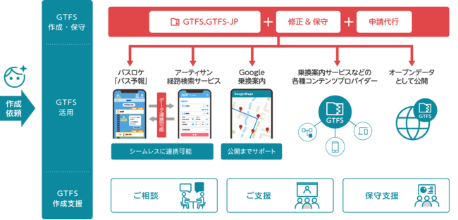 「まかせてGTFS」では、GTFS及びGTFS-JPの作成と保守の両方をご支援することが可能です。