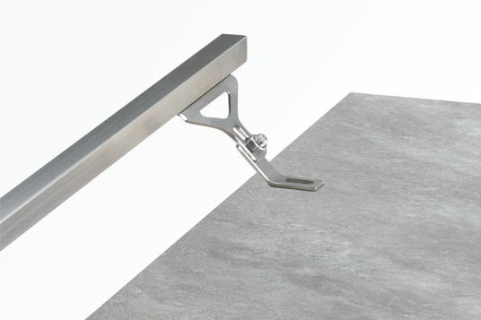 Previo G7 の共用ブラケットは「窓」を備える(特許出願中)。モルタルの食いつきを高め、抜けやぐらつきを防ぐだけでなく、角棒・フラットバー下面へのモルタル充填の良否を容易に確認でき、施工不良を抑止する。また、本体・アーム・窓・ボルト・ナット・ビスをふくめた複雑な形状全体が、モルタルとの堅固な一体性をもたらし、割れや欠けのない、いつもまでも美しいRC階段が実現される。