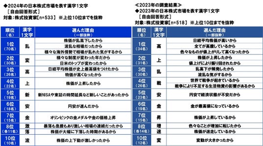 株式投資家(533名)に、2024年の日本株式市場を表す漢字1文字を聞いたところ、1位「乱」(70名)、2位「変」(30名)、3位「高」(26名)、4位「上」(22名)、5位「新」(19名)となりました。