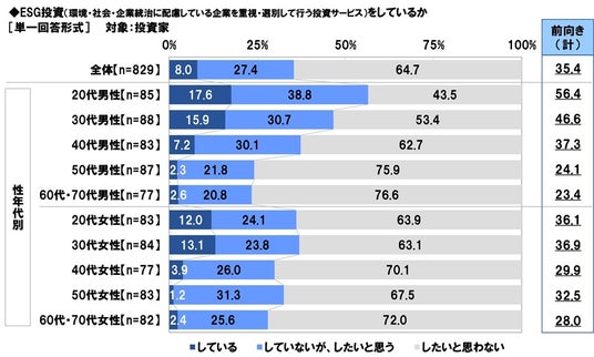 - 投資家の35%が「ESG投資に前向き」、20代男性投資家では56%