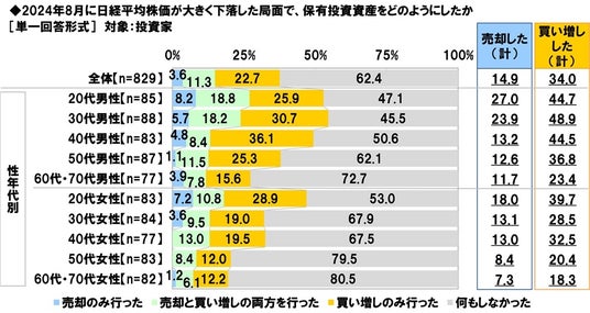 年代別にみると、『買い増しした』と回答した人の割合は、20代男性(40.0%)が最も高くなりました。20代男性投資家には、さらなる値上がりを予想して買い増しした人が少なくないようです。